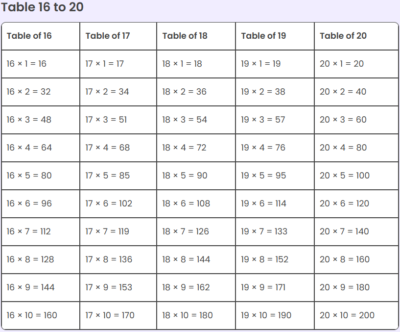 The multiplication tables are listed in Tables 1 through 20. Multiples of whole numbers ranging from 1 to 20 make up the table. Students can quickly solve multiplication problems by using math tables 1 through 20. We can skip the table of 1 and commit the tables 2 through 20 to memory since it yields the same result (since all the integers are multiplied by 1). Prior to moving on to larger number multiplication tables, students can master the math tables from 1 to 10. For the convenience of the pupils, we have included here some pointers and strategies for learning the tables by heart.